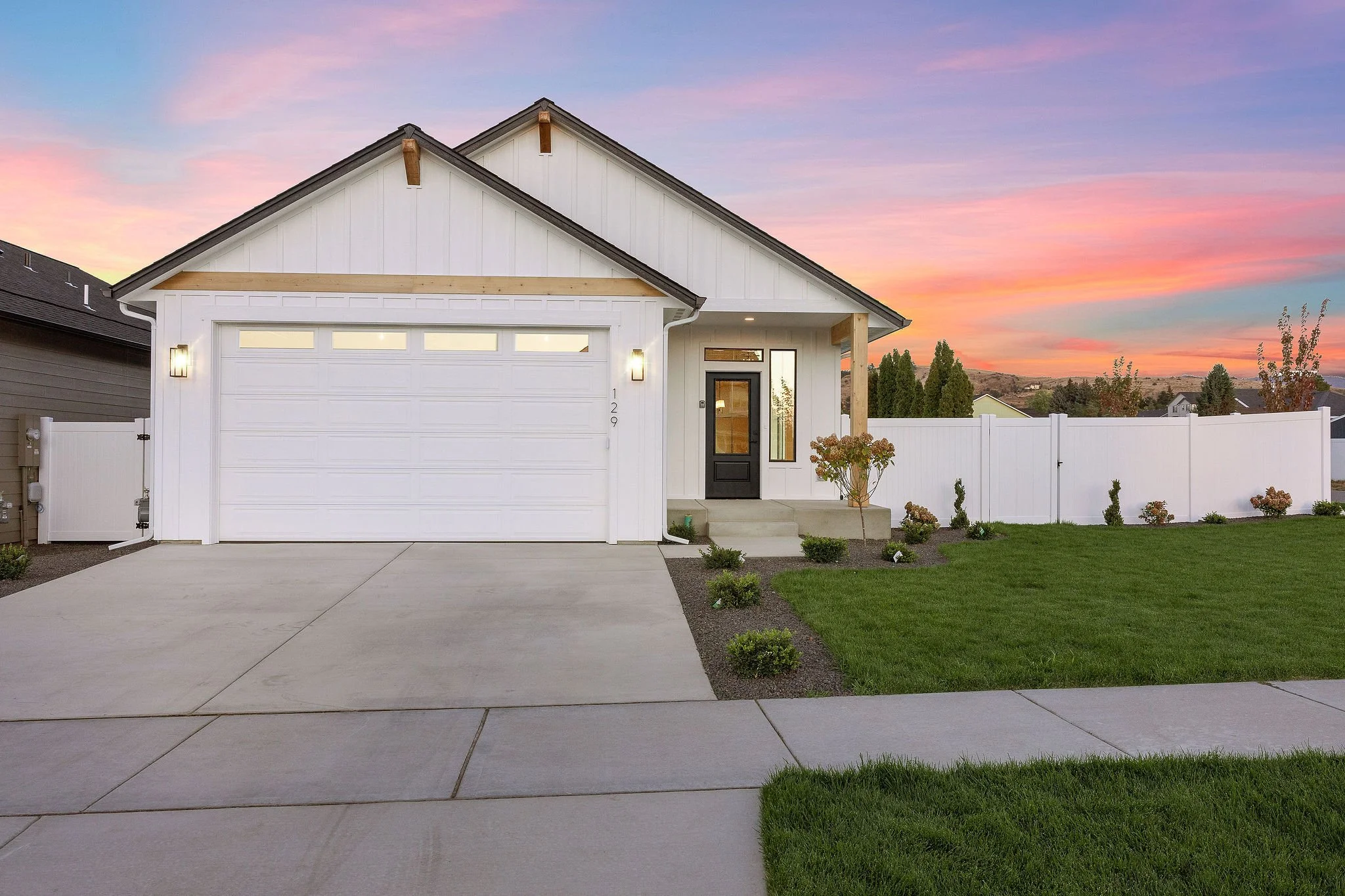 Built by Lucas Homes, this charming farmhouse features a clean white exterior with black trim, cedar accents, and beautiful hydrangeas throughout the landscaping!